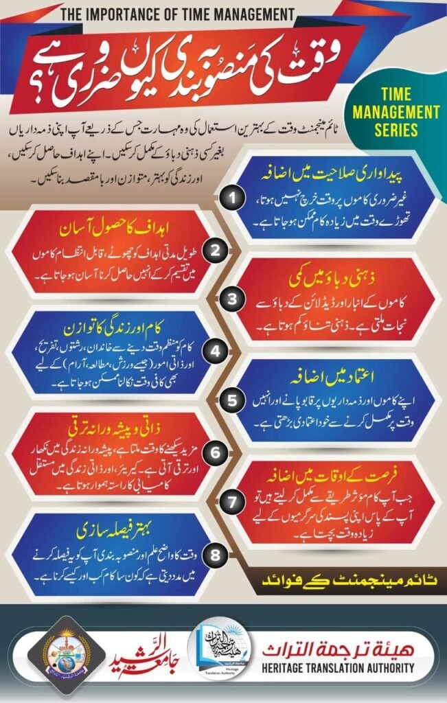 جامعۃ الرشید کے ذریعہ شائع شدہ زیرِ نظر پوسٹر میں وقت کی منصوبہ بندی کی جو تعبیر پیش کی گئی ہے، وہ علمی معیار پر جانچنے سے معلوم ہوتا ہے کہ یہ سرمایہ دارانہ مادیت کے بیانیے کو دہراتی ہے اور یہ جدیدیت میں گندھی ہوئی ہے، اس عنوان پر کسی ایک کارپوریٹ مضمون کو یا کتاب کو سامنے رکھ لیا جائے تو یہ بات واضح ہوجاتی ہے کہ اس پوسٹر میں بیان ہوا تصور وقت اسلامی نہیں ۔ “پیداواری صلاحیت میں اضافہ”، “پیشہ ورانہ ترقی”، “دباؤ میں کمی”، “فرصت کے اوقات” اور “بہتر فیصلہ سازی” جیسے نعروں میں انسان اور وقت، دونوں کو کارکردگی (performance) اور دنیاوی نفع کے اوزار بنا دیا گیا ہے۔ یہ زاویۂ نظر خواہ نیک نیتی سے ہی اختیار کیا گیا ہو اسلامی مقاصدِ حیات (توحید، عبودیت، تزکیہ، عدل، اور عمارتِ ارض) کی روح سے کم از کم دو بنیادی سطحوں پر انحراف پیدا کرتا ہے: ایک، مقصدِ حیات کو مادّی کارکردگی تک محدود کرنا؛ دوسرے، وقت کو امانت کے بجائے سرمائے کی طرح برتنا۔ چنانچہ اس تعبیر کا علمی محاکمہ لازم ہے تاکہ ہمارے دینی اداروں کی زبان و فکر بھی وحی کے افق سے متصل رہے، نہ کہ جدید معاشی مادی استعارات کے زیرِ اثر۔